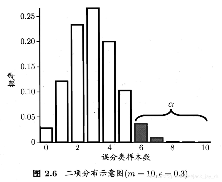在包含m个样本的测试集上, 泛化错误率为 的学习器被测得测试错误率为 的概率:
