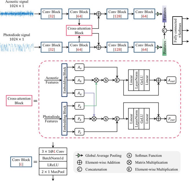 采用光电传感器(photodiode)与声学传感器(microphone)同步采集铝合金激光焊接过程的一维时间序列信号;依据焊缝顶部与背面形貌将数据划分为 3 类穿透状态。 提出交叉注意力融合网络 CAFNet,直接在原始时域信号上交互式融合光电与声学信息,实现穿透状态分类,避免事先进行时频分析与特征工程。